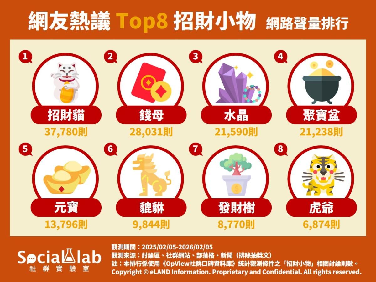 《Social Lab社群實驗室》本次透過《OpView社群口碑資料庫》追蹤近一年「招財小物」相關話題的網路聲量,帶您了解網友熱議的八大招財小物有哪些。