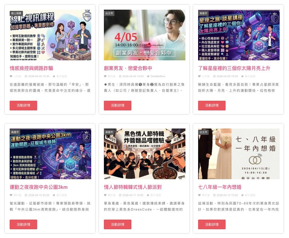 別人說你太挑,其實你要的不是長輩都點頭的完美條件,而是一種「我們竟然連這點都超合」的靈魂驚喜感。有趣的靈魂標籤,不應該只躺在自介欄裡,今年春天換上一身最愛的穿搭,報名一場最有感的主題式聯誼。喜歡的生活,值得有一個頻率相同的人,陪你一起過。