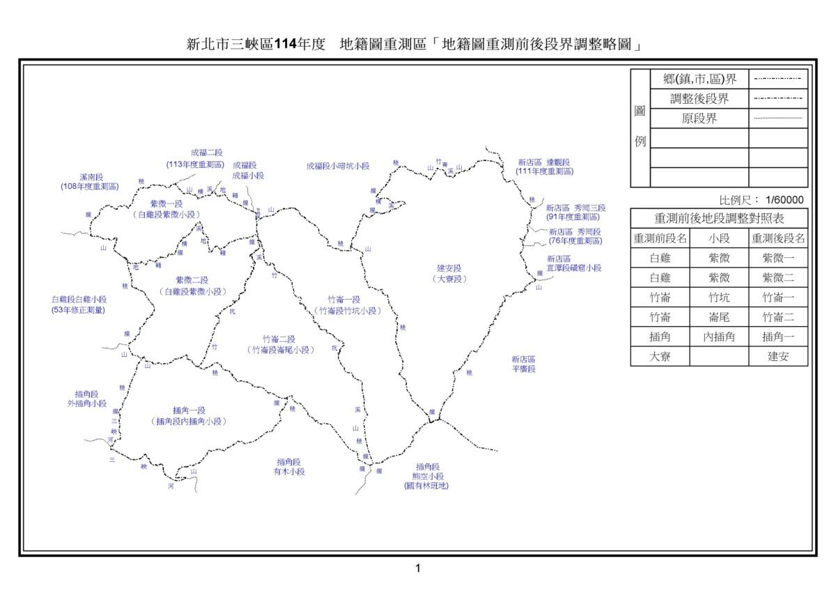 114年度三峽區大寮段、竹崙段竹坑小段、竹崙段崙尾小段、白雞段紫微小段、插角段內插角小段等5地段地籍圖重測成果已辦理完竣,重測後將更改段名為建安段、竹崙一段、竹崙二段、紫微一段、紫微二段、插角一段等6地段,將自114年10月15日起至11月14日止辦理重測成果公告閱覽事宜,假日照常受理。