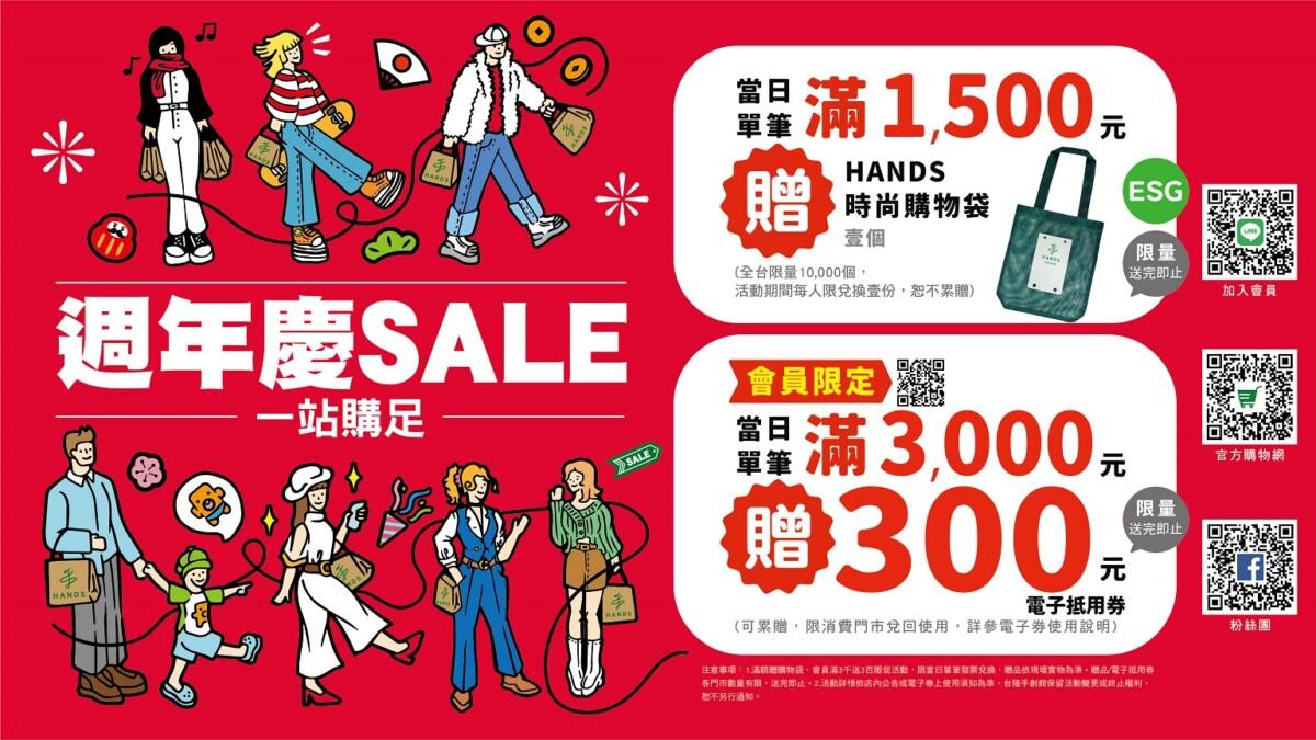 台隆手創館〈一站購足週年慶〉10月9日起登場,HANDS全台門市同步百貨商場週年慶促銷期間,讓手創館愛用者購買年度限定買一送一居家生活好物,以及各門市獨家推出的週年慶優惠組促,各店享超過150組生活商品享週年慶才有的超值囤貨價。搭配各商場贈送的百貨周周來店禮、滿千送百及銀行禮回饋(活動依各百貨公告為準),台隆手創館週慶獨家品牌滿額禮,祭出單筆購物滿1,500贈送HANDS時尚購物袋,HANDS會員獨享滿3,000元送300元品牌電子券。