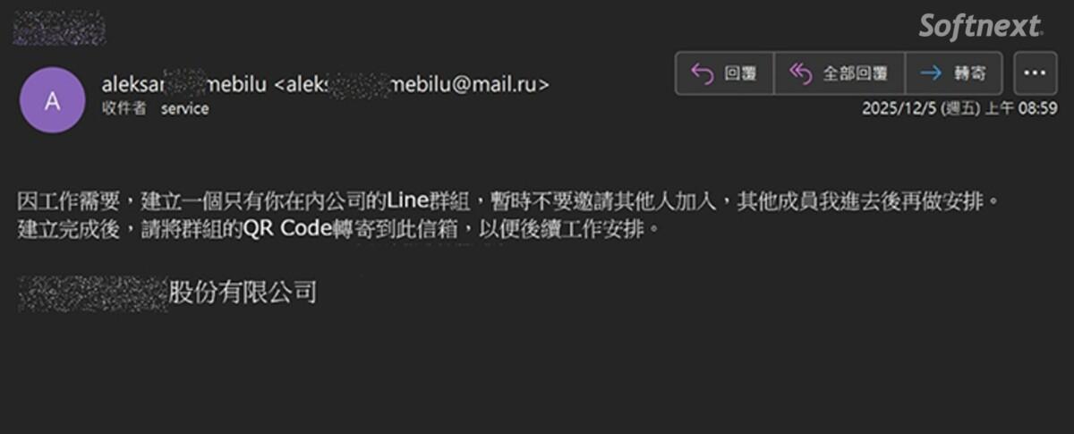 近年來,企業持續遭遇以「公司高層名義」發動的社交工程攻擊。在今年第四季,中華數位科技與 ASRC 研究中心發現有這種攻擊手法有大量氾濫的趨勢,主要是透過電子郵件要求員工加入指定的 LINE 群組。這類詐騙看似溫和,不含惡意連結或附件,因此不易被資安防護設備檢出,且利用威權作為社交攻擊手段,更容易降低收件者的警覺心,但背後的目的卻是引導財務人員匯款至境外帳戶,造成企業重大損失。