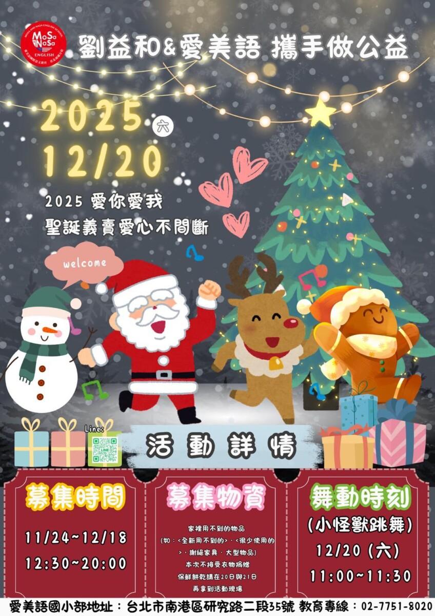 劉益和教育學院與愛美語胡適分校將於 2025 年 12 月 20 日(六) 11點,攜手台北家扶中心 聯合舉辦一年一度的「南港聖誕義賣會」。活動自創辦以來深受地方居民支持,不僅成為每年南港歲末最具溫度的公益盛事,希望傳遞給孩子「分享與善良」的教育核心精神。