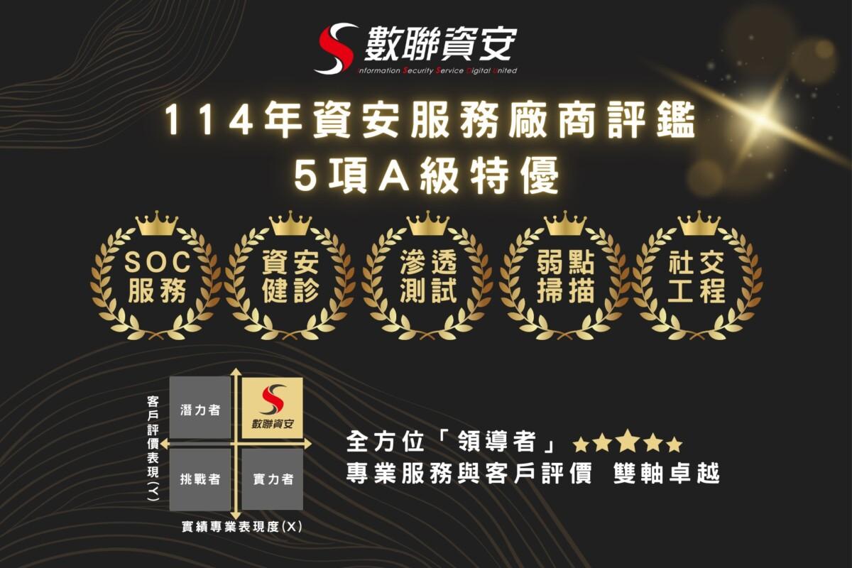 此次評鑑中,數聯資安的五項A級服務「SOC監控」、「資安健診」、「滲透測試」、「弱點掃描」及「社交工程演練」,服務範疇橫跨資安監控、檢測、驗證、演練,完整涵蓋攻防生命週期。全項目同步獲得A級肯定,代表數聯資安不僅具備深厚技術實力之外,更能以一致且穩定的高服務品質,協助企業降低資安治理與風險。