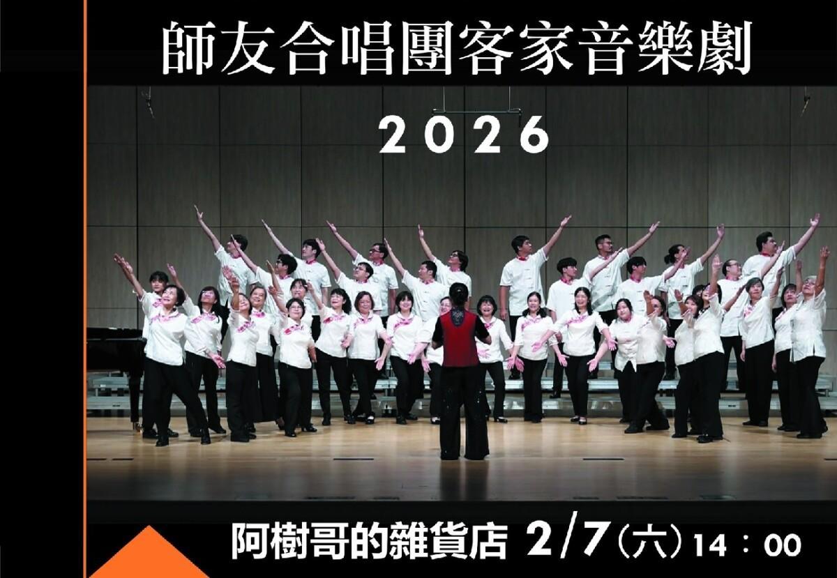 師友合唱團將於 2026 年 2 月 7 日(六)在台北市客家音樂戲劇中心,推出全新客家合唱音樂劇《阿樹哥的雜貨店》。本作以客家村莊老榕樹下的傳統雜貨店為敘事核心,描寫便利商店進駐後,地方生活結構與世代價值所面臨的轉變,透過戲劇與合唱交織,呈現仍在運作中的社群關係與文化情感。